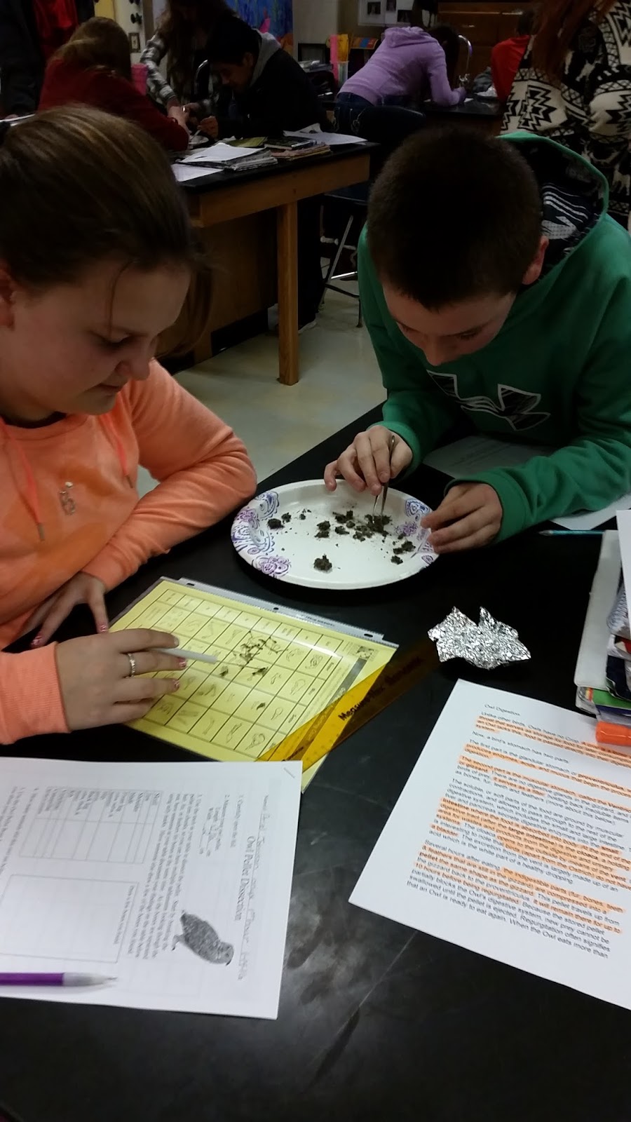 7th grade students dissecting owl pellets in Ms. Berezowitz's and Ms. Hancock's science classes.